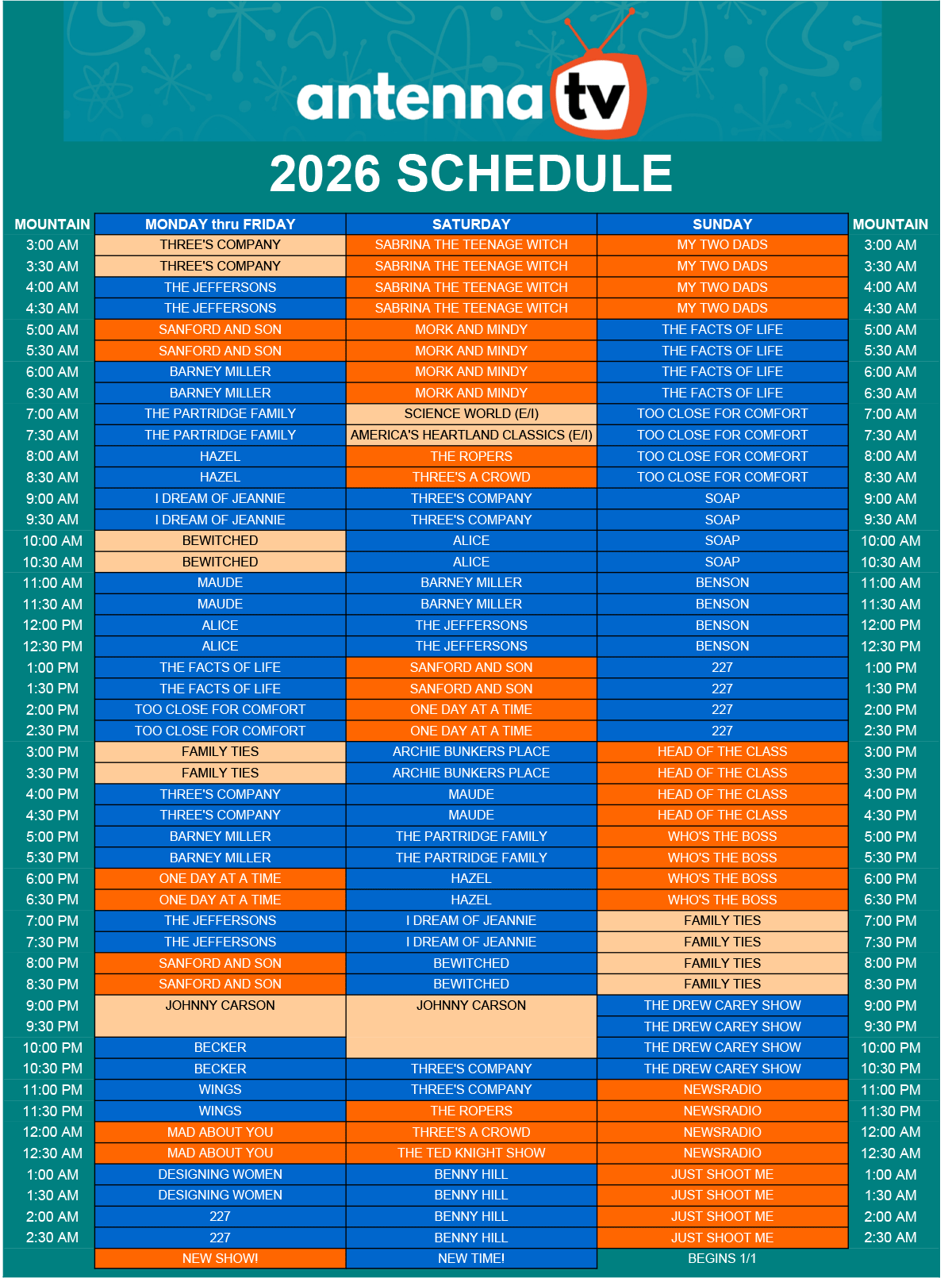 Mountain Schedule East-West ScheduleHawaiiAlaskaPacificMountainCentralEastern Download Mountain Schedule View this profile on Instagram Antenna TV (@antennatv) • Instagram photos and videos
